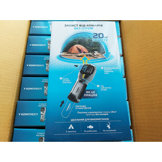 - в комплекті 1 картридж із газовою сумішшю та 3 пластини з репелентом на 12 годин безперервної роботи.