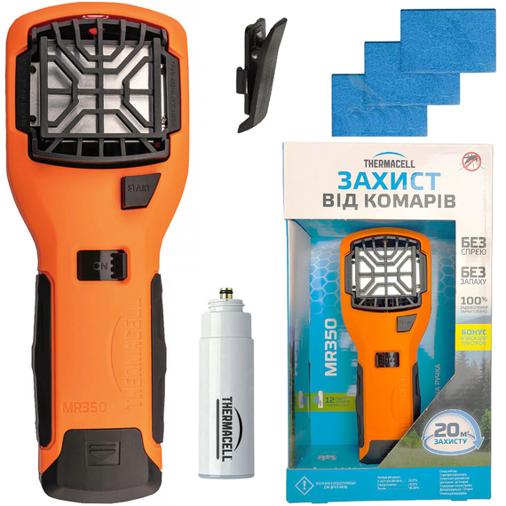 Комплект Thermacell Portable Mosquito Repeller MR-350 включає сам пристрій, 1 картридж із газовою сумішшю та 3 пластини з репелентом, що розраховано на забезпечення захисту протягом 12 годин. При необхідності картриджі та пластини можна докупити окремо.