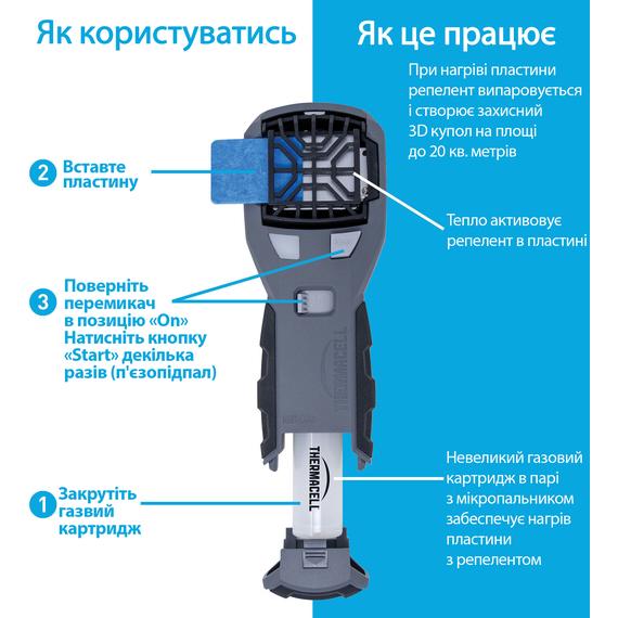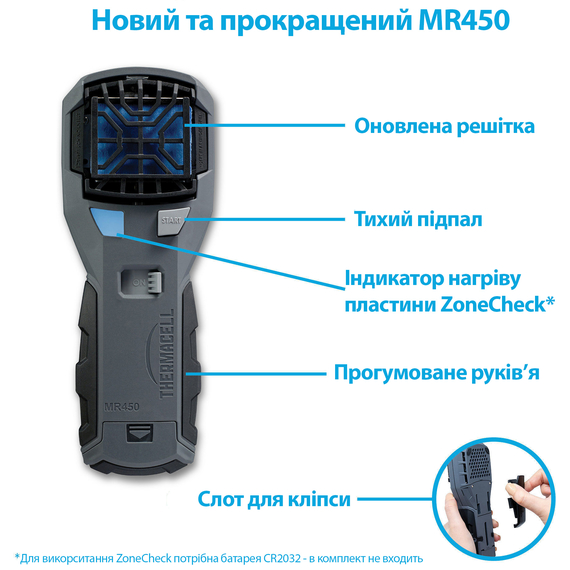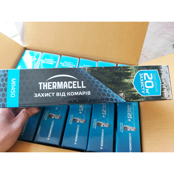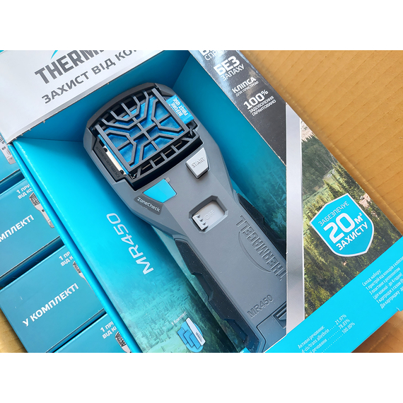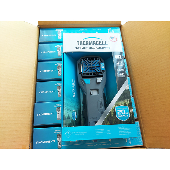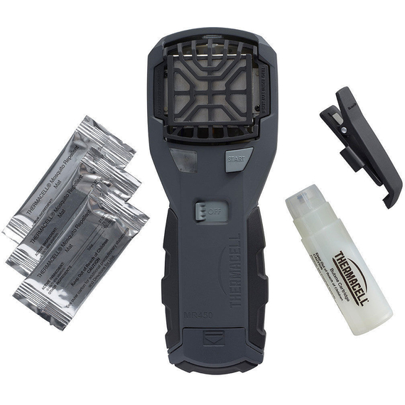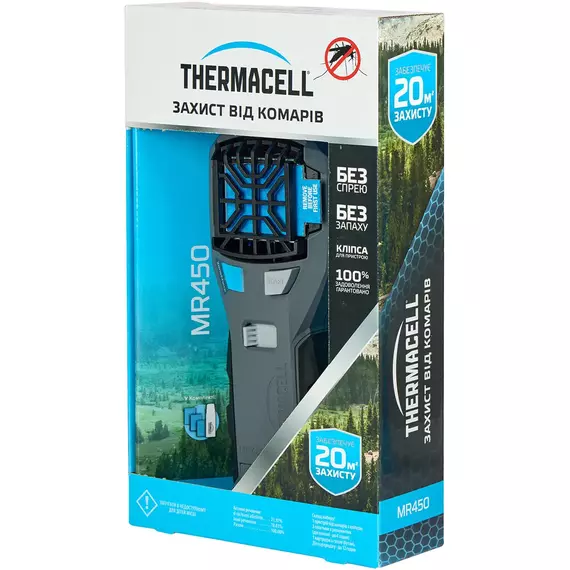 Пристрій від комарів Thermacell Portable Mosquito Repeller MR-450 - нова модель, що дозволяє комфортно перебувати на природі і не турбуватись про те, що комахи завадять займатися улюбленим захопленням. Для його роботи необхідно встановити газовий картридж, який фіксується в рукоятці і пластину з репелентом. Після натискання клавіші пристрій моментально почне діяти і вже через кілька хвилин утворюється своєрідний щит,  який не пропускає комах. Відлякувач створює надійний захист від москітів на площі до 20 кв. метрів (на відстані до 5 метрів). Під час роботи не виділяється ні запаху і ніякої рідини, тому його використання є абсолютно безпечним і чистим.